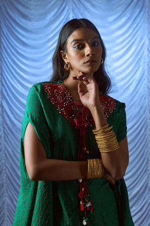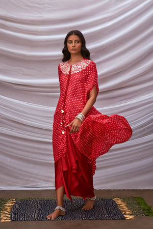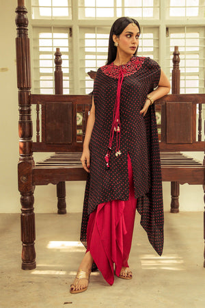 Black and red Bandhej Silk Cape with thick embroidery detail on the neckline, and free-flowing tassel detailing in the centre. If this is not enough drama, to add some more statement, this ensemble comprises a silk drape skirt.