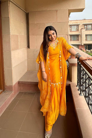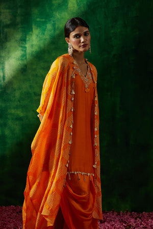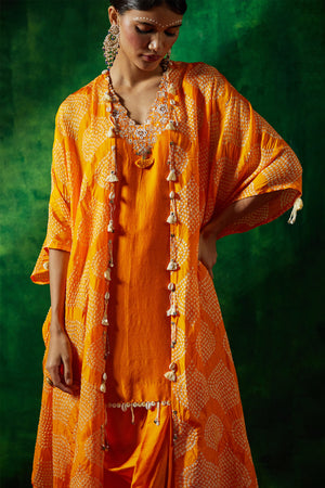 Bandhni cape set with chanderi kurta and dhoti skirt