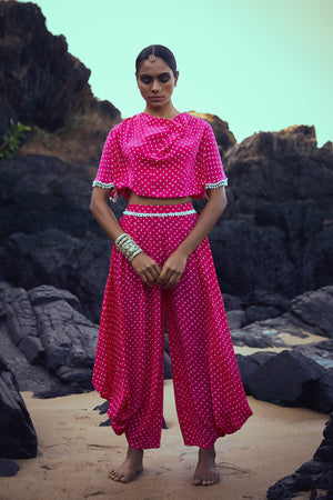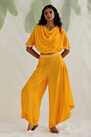 Sunshine Yellow Bandhej cowl top with embellished detailing on sleeves and matching high-low hem cowled palazzos with an embellished waistline. Keep the locks soft and shoes flat for this easy-chic look and let the volume add all the drama. Disclaimer: As bandhni and leheria is hand made little difference in pattern and colour is possible