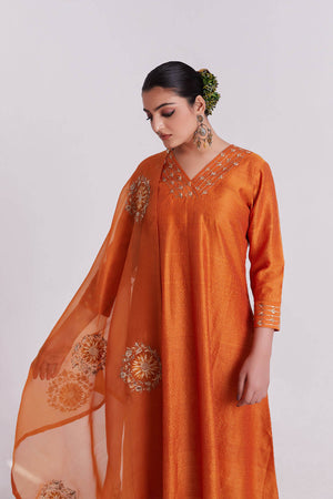 This zari checks kurta comes with a dupatta embroidered with sunflowers