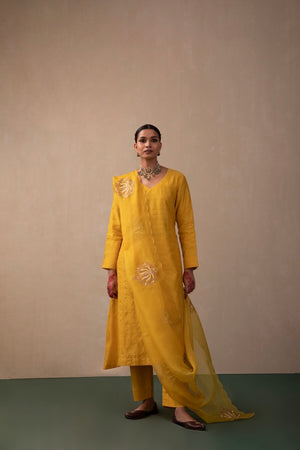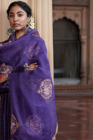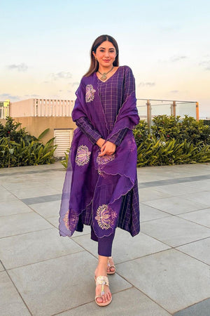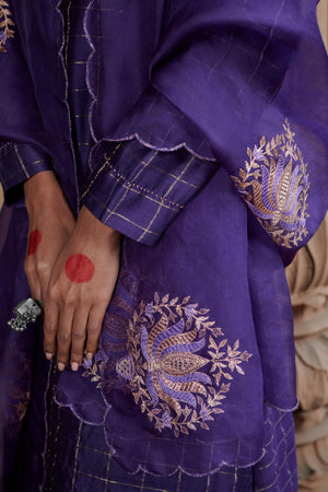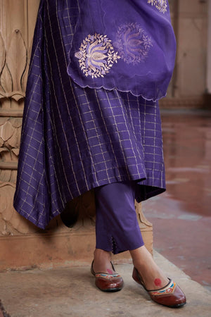 The iconic Madras checks gets a fusion twist with this chanderi kurta, woven with zari checks. It is teamed with pants and dupatta with lotuses embroidered on it.