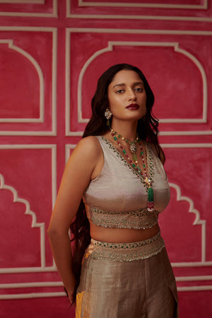 Paired with matching antique silver pants and crop top, with embroideries of dori, resham and pearls, this gharchola cape with a embroidered collar is truly one of a kind, representing impeccable craftsmanship.