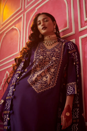 The yoke of kurta is beautifully embroidered in our signature peacock and lotus motifs. It comes with an embroidered organza dupatta with gharchola border and straight pants.