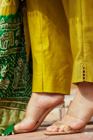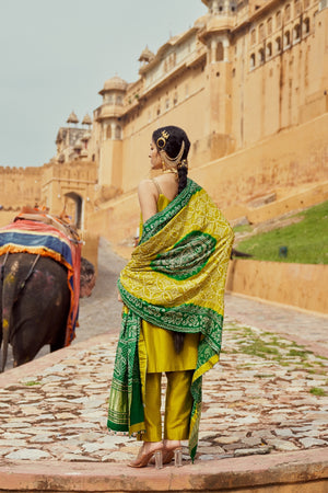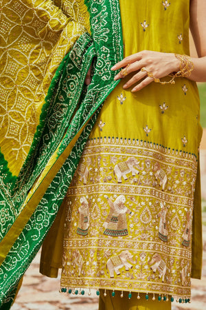 A simplistic Kurta accompanied by a heavy border and dupatta, the piece encapsulates the beauty of Rajasthani celebrations with the meticulous embroidery of elephants, daandiya and traditional rajasthani woman. From a formal dinner to a pooja at your house, this set is just the right combination of beauty, comfort, and artistry.