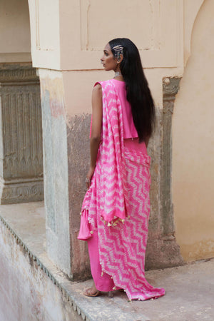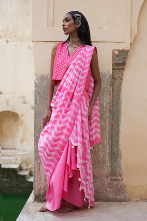 A traditional, hand woven garment of Assam, the mekhela chador is a handwoven, two-piece attire worn by the women from the region. The mekhela is the lower piece, a sarong-like fabric that is wrapped around the waist like a skirt. Unlike a traditional saree, the pleats in the mekhela are fewer in number, and are made on the right side and tucked in. This is Pinkcity version of mekhla saree with a-line beaded blouse