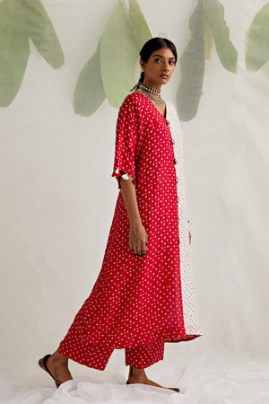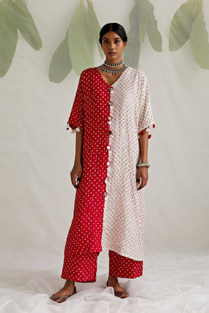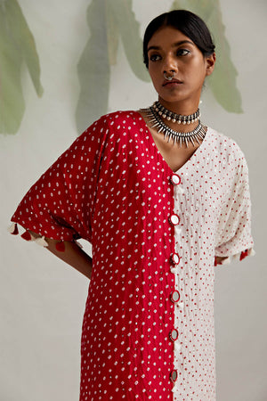 Half and Half Bandhej Red and white comfy Kaftan with tassel detailing on the sleeve hem and mirror detailing on the centre seam, worn with red Bandhej pants. Layer up some tribal silver jewellery, braid up your hair in a whimsical braid & get ready for some serious head-turning.