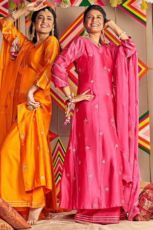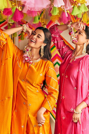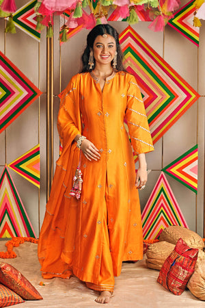 Kurta is embellished with intricate Gota and Resham work. It comes with a palazzo and pure chiffon dupatta.