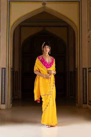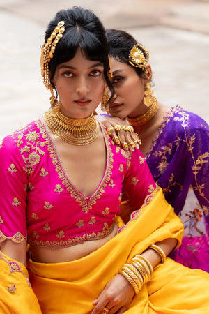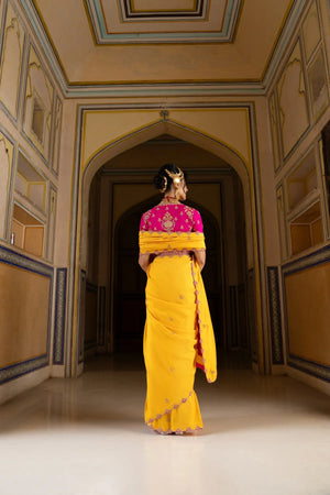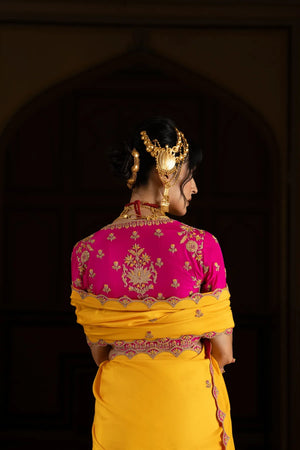 This saree is scalloped with rani colour to give it a character. The blouse is a beautiful garden of lotuses. You have to wear it to be a queen in your mind.