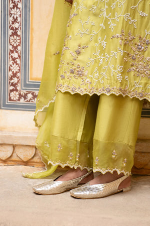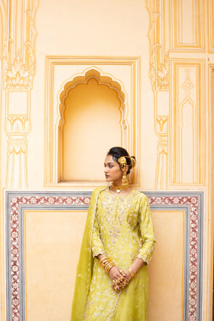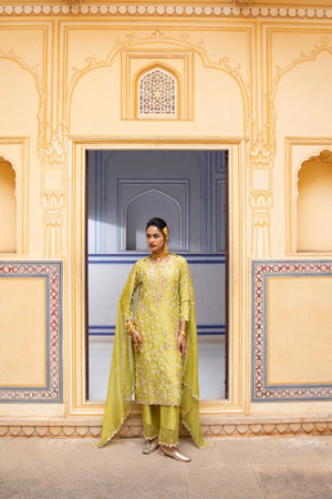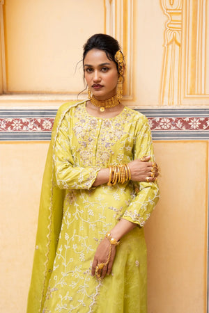 This kurta set is beautifully decorated with french knots, moti, resham, zardozi work. Its for the ones who want to go classy.