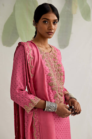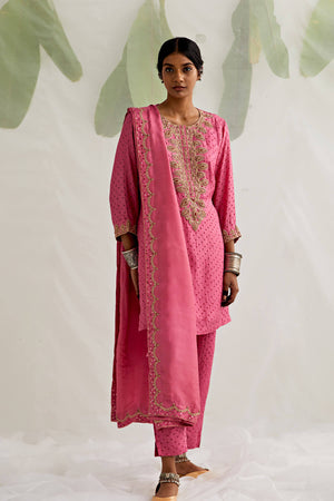 Rose Pink Bandhej Kurta with embroidered yoke and button detailing, worn with matching Bandhej pants and Silk dupatta with embroidered detailing. Get those silver cuffs out of your jewel boxes and donne a thick payal to keep up the boho vibes. Complete the ensemble with comfy mojris to assure nothing gets in the way of some festive dancing.