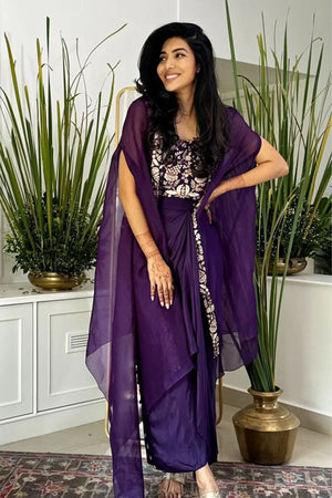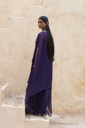 Coloured by the most royal shades of violet, complemented by a majestically embroidered blouse, this cape set comes with a shell detailed pick up skirt