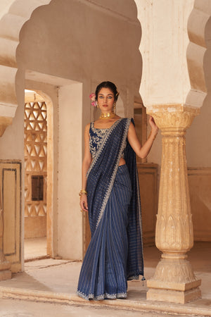 This blue stripe saree comes with a beautiful border.Blouse and belt has detailed lotus embroidery
