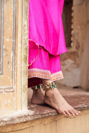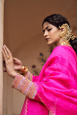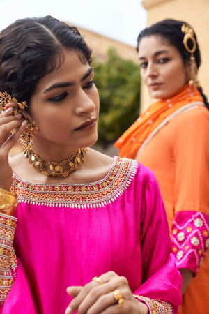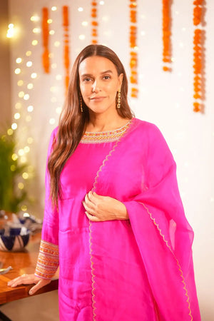 This hot pink kurta is highlighted with colourful beaded embroidery .It is a statement look in itself.