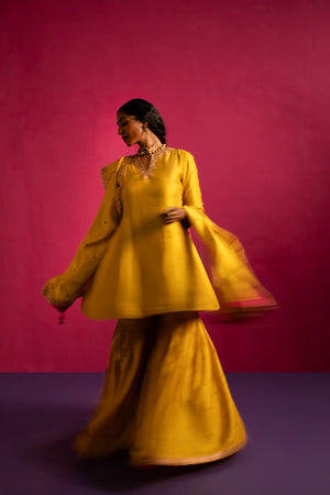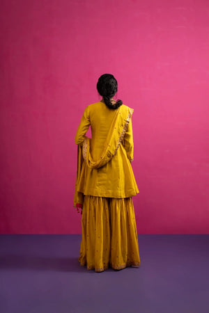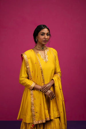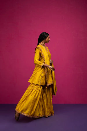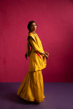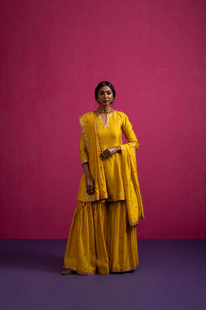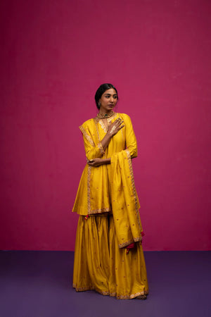 This yellow sharara set has a resham touch of rani and purple. It is a perfect haldi outfit.