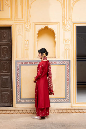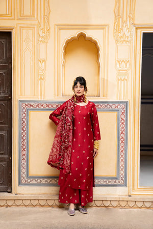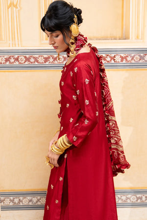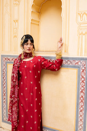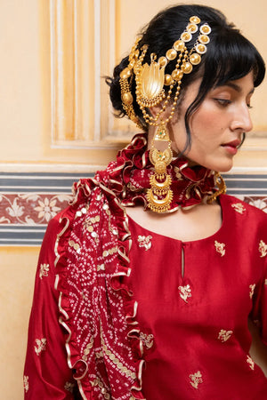 This kurta set is fully decorated with tiny buttis .It comes with a gota dori embroidered georgette dupatta with frills on the hem, along with beautiful traditional motifs in bandhni.