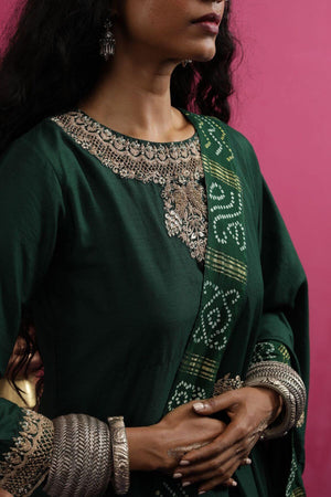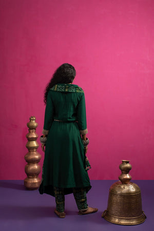 This moonga kurta is attached with a dupatta that can be draped in many ways. It also comes with a gharchola pants.