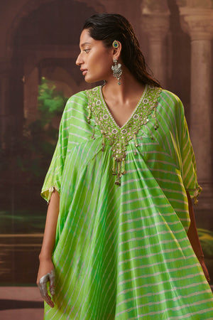 This is a statement leheriya kaftan with mirror and studs embroidery on the v-neck and sleeves.