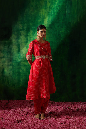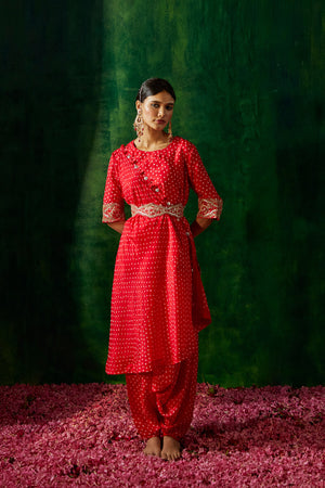 Silk bandhni top with gota embroidery detailing on sleeves .It is worn with a bandhni drape overlay and a statement belt.