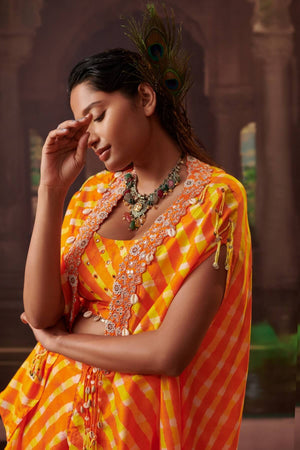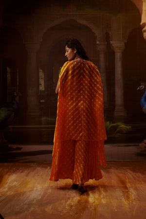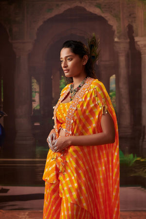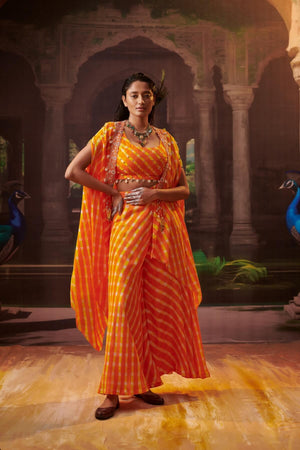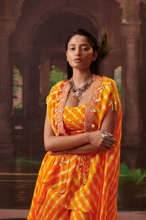 Our co-ord cape-sharara set with a whimsical chevron leheriya print. The embroidery and tassel detailing on the collar of the cape makes this the perfect “less is more” ensemble! All you need to do is stack up all the silver kadas you own and you are ready to own the floor.