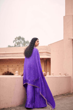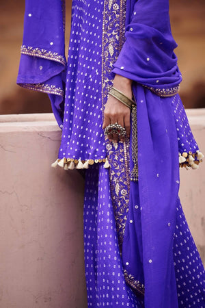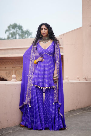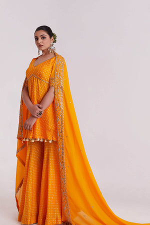 Embroidered bandhni silk short anarkali and gharara paired with chiffon dupatta