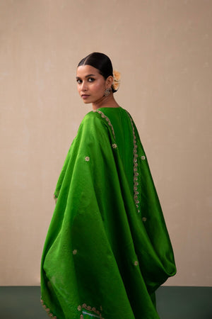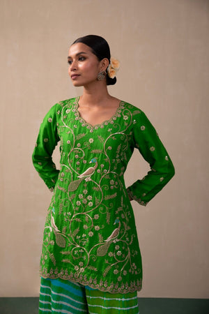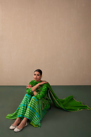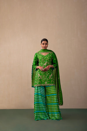 This Kurta With Peacock Jaal Embroidery Using The Classic Gota And Dori Embroidery Comes With Leheria Sharara & Embroidered Dupatta. Let Your Larger Than Life Maharani Haar Elevate This Picture Perfect Ensemble!