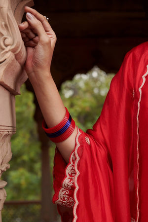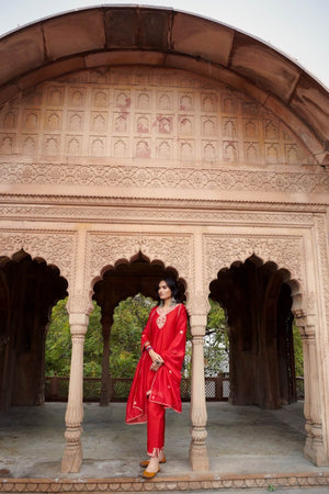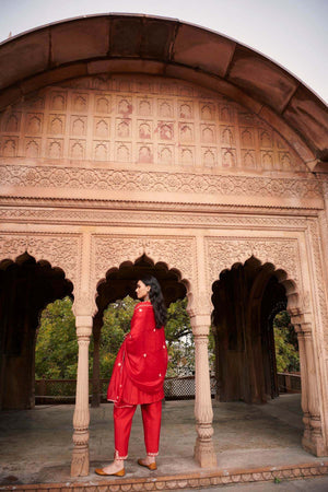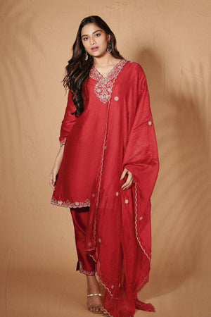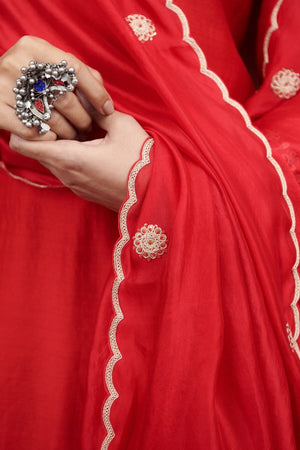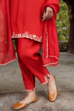 Short red kurta with marodi embroidery, paired with our signature cigarette pants and an organza dupatta with embroidery along the edges.
