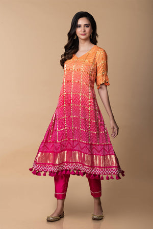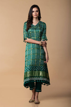 This gajji silk Gharchola kurta is embellished with beautiful mirror work and tassels.It comes with a cigarette pant