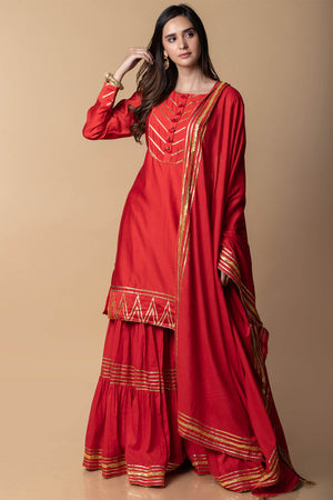 This sharara set is embellished with gota lace .Sharara is three layered.It is very light weight,looks very festive for your smaller festivals.