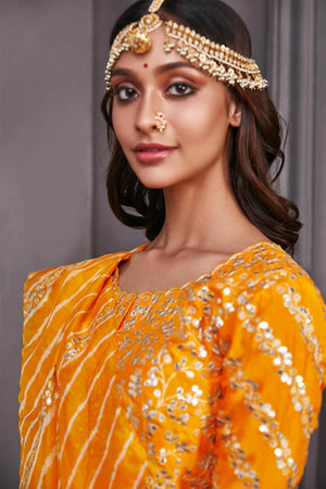 The organza leheria saree is a perfect outfit to attend all types of occasions and festivals. It comes with an embroidered blouse with gota work and has beautiful latkans in it. </br> Disclaimer: As bandhni and leheria is hand made little difference in pattern and colour is possible