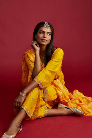 The Saaz short kurta salwar set exude glamour as it is the perfect example of intricate details in an outfit. Go fresh with kohl-lined eyes, pink lips and a slight blush on the cheeks with this Patiala sets.