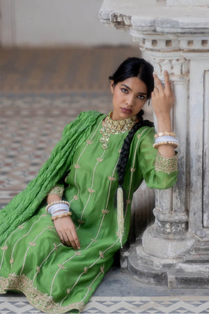 Green kurta with dori and pearl embroidery, pants and a bandhani Dupatta with lotus motif, finished with tiny tassels. Chaandbaalis with a loose braid, tan mojris in your feet and you are ready, you walking sunshine ☀️
