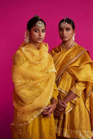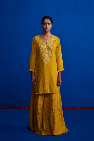 Mustard crushed silk kurta and sharara set with delicate mirror embroidery on the yoke