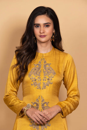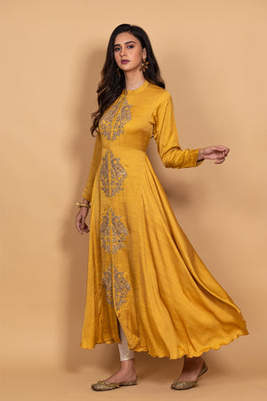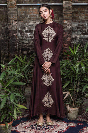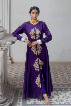 A beautiful gown with peacock motifs; that is balanced equally on both sides. It is perfect for evening wear.
