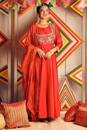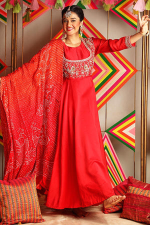 Timeless festive Anarkali in warm colors detailed with subtle zardozi work. It comes with a bandhani dupatta in two shades of red and orange which features beautiful peacock motifs.