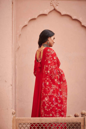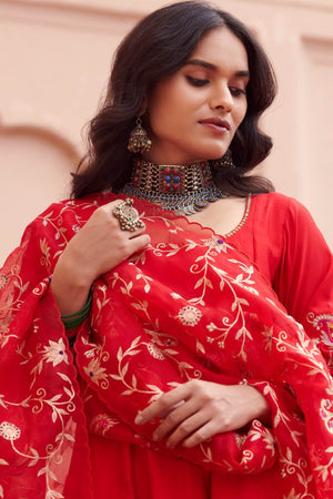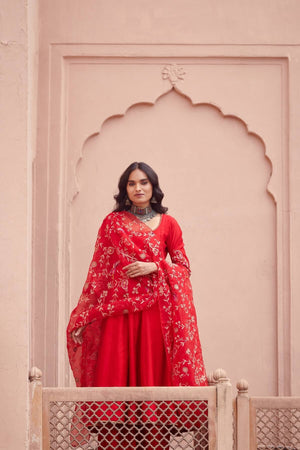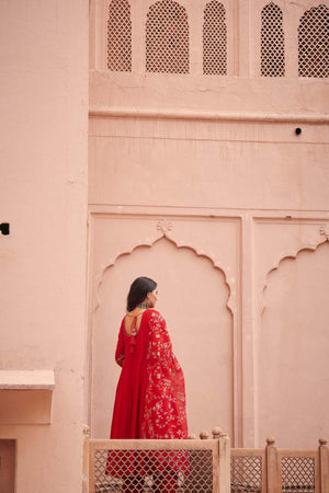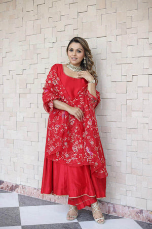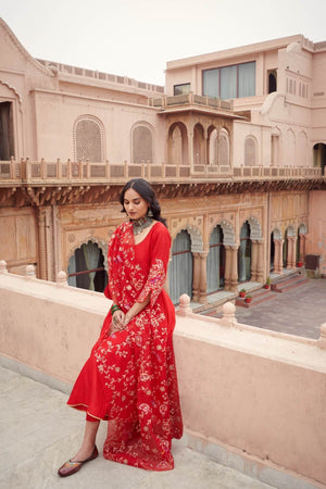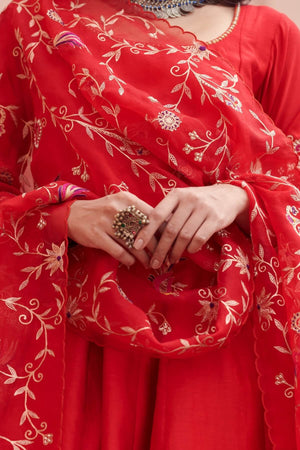 The red embroidered anarkali set features detailing on its neckline and intricately embroidered sleeves. The silk chanderi anarkali comes with a beautiful flair, and is paired with straight palazzo pants and hand crafted jaal embroidered organza dupatta.