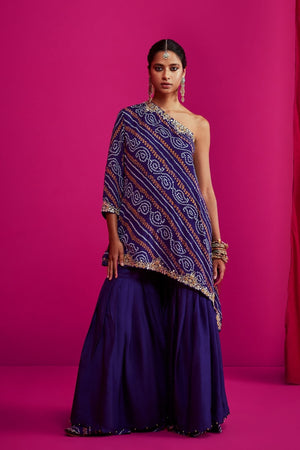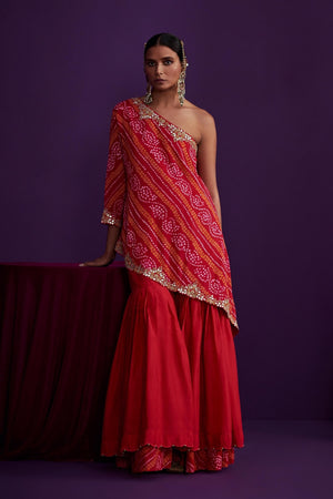 One shoulder bandhani kurta with a zari embroidered neckline, sleeve hems and edges, paired with sharara pants