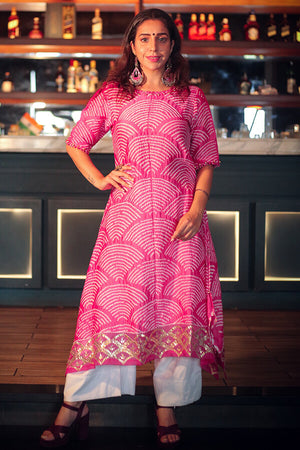 This silk Chanderi bandhej tunic has bandhani and Gota embroidery matched in semicircular patterns. Team this up with cigarette pants, and you are ready to go.