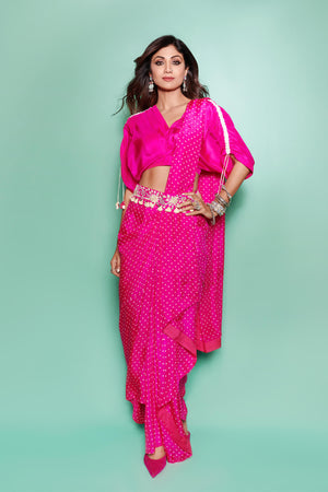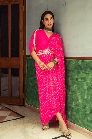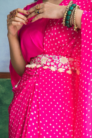 Hot Pink bandhni concept saree with a kaftan style blouse and with shoulder detailing. An embellished belt ties this look together beautifully and is finished with a free-flowing tassel party .