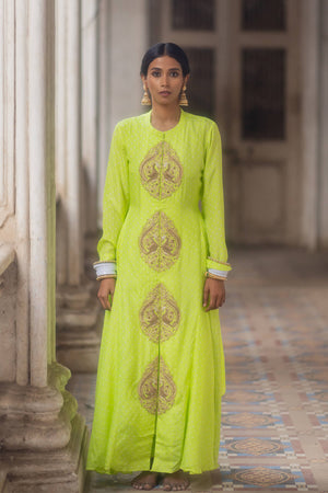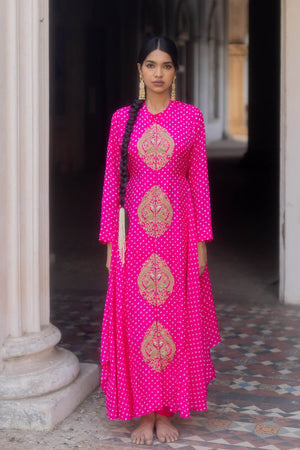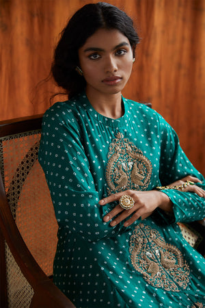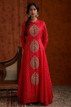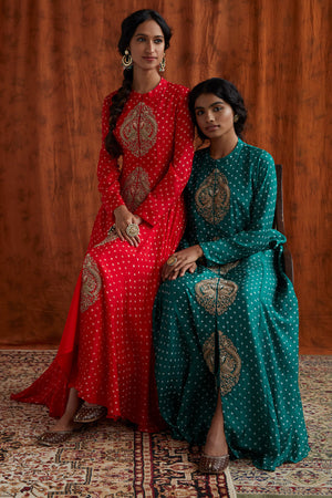 Bandhani bandhgala maxi in royal shades of Red & Green with daintily embroidered peacock motifs in the center, making it the perfect ensemble for an evening with your favourite bunch. Wear your hair in a loose braid, put on some charming chandbaalis and up your effortlessly chic game