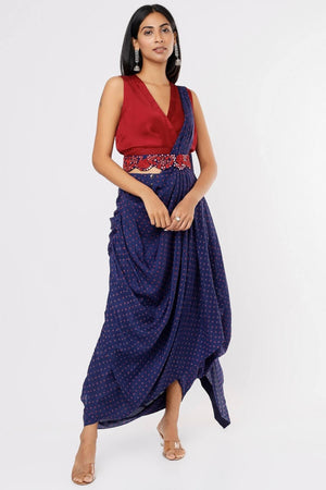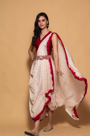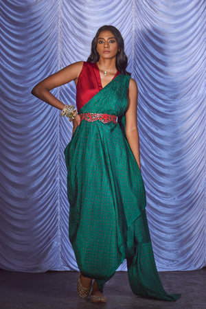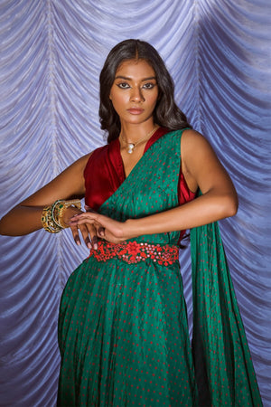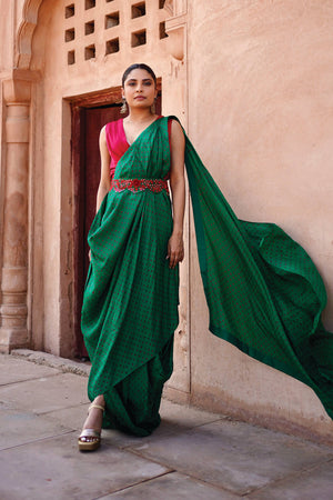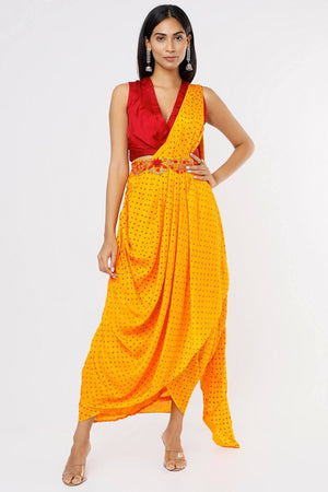 Rich Silk Blouse And Silk Bandhani Draped Concept Saree With A Scallop Belt Embellished With Mirror Work And Floral Thread Work To Make Saree-wearing Fun And Fuss-free. The Dainty Shell And Tassel Detailing Flowing With The Belt Add A Stunning Texture To This Fierce Ensemble.