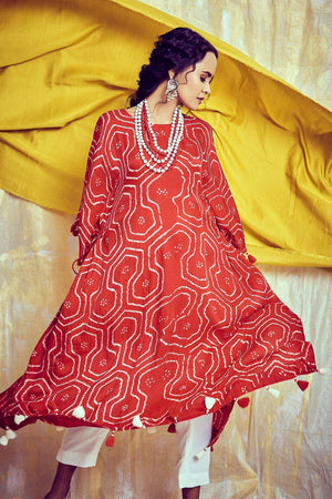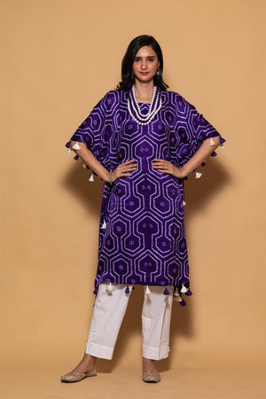 Kaftans the new couture!This kaftan has gathers on sides which makes you look more structured.It is a versatile dress.It can be styled in many ways. Disclaimer: As bandhni and leheria is hand made little difference in pattern and colour is possible