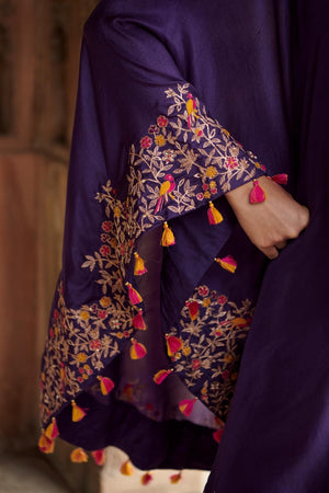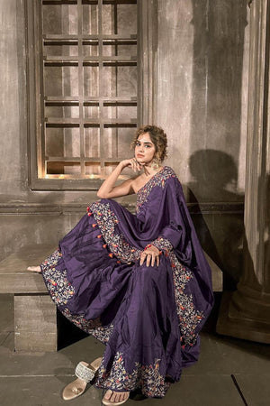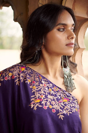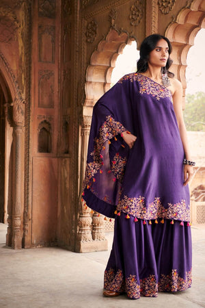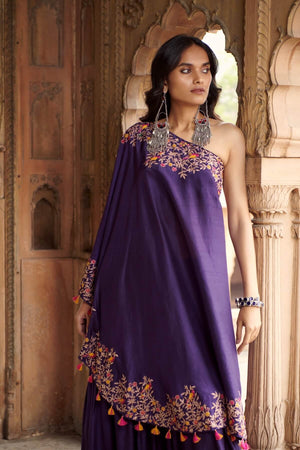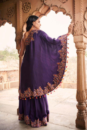 Purple Sharara Set, comprising of sharara pants and a one shoulder tunic, both with heavy Resham, zari and pearl embroidery.