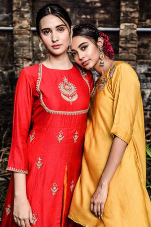 Red Anarkali kurta with a front slit. It is embellished with beautiful Dori embroidery. It is teamed up with a tie and dye pants in red and orange color.