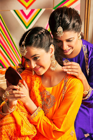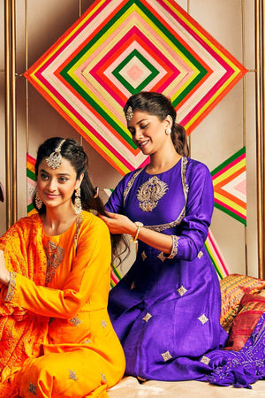 Kurta is embellished with beautiful Dori and Resham work and is teamed up with bandhani dupatta. Beautiful peacock motifs and handcrafted butas further accentuate the beauty of this set.