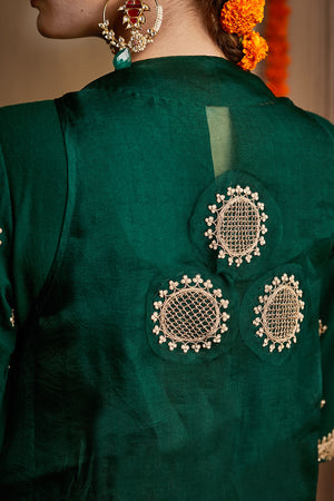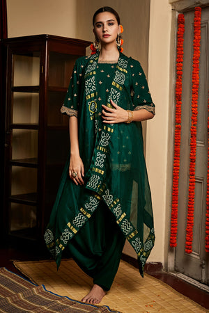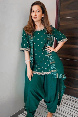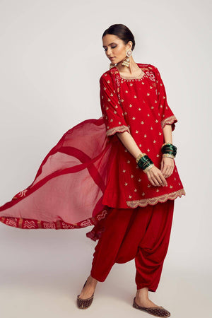 It is a three-piece set that includes short kurta, harroms, and Gharchola cape. It is lightweight and very easy to carry.