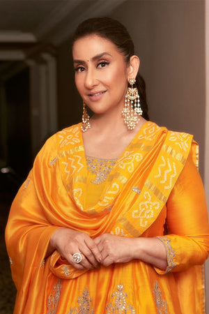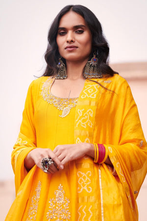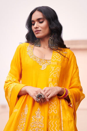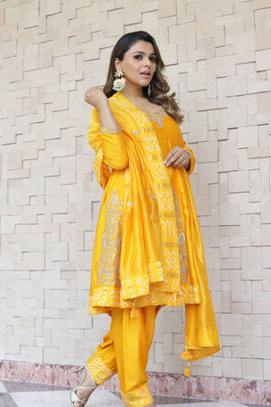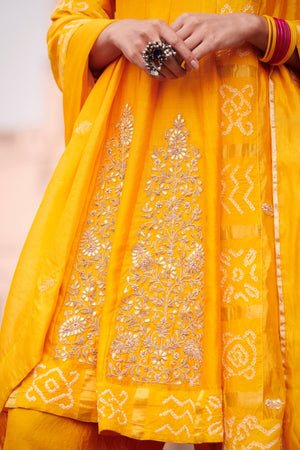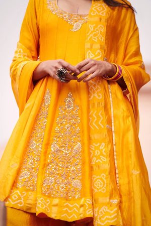 This kurta is embroidered in alternate kalis and neck with gota work.It is finished with gharchola border on hem.It comes with a patiala salwar and embroidered dupatta.
