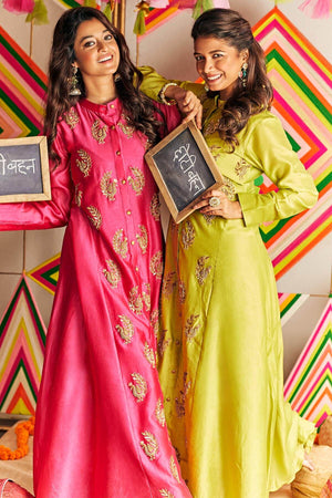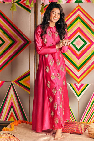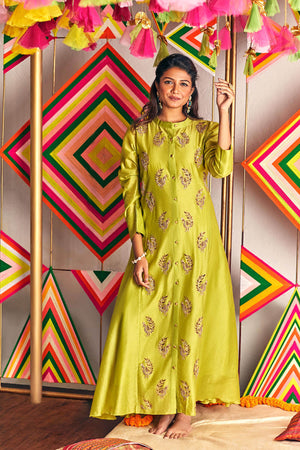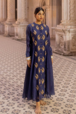 This Chanderi kurta has beautiful peacock motifs that are spread throughout on the front panel.