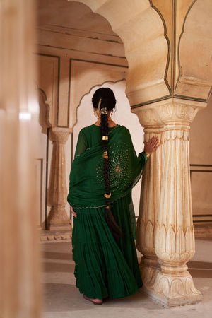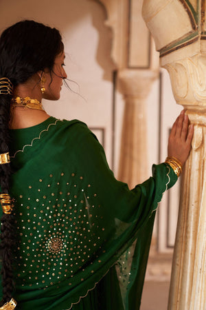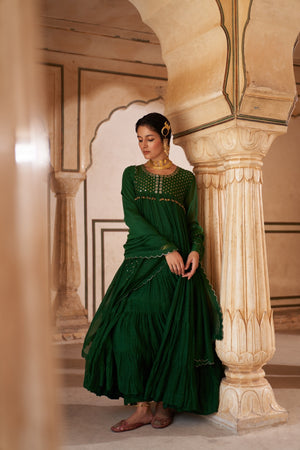 done with Kasab embroidery and Metal tikki detailing, this Layered anarkali is just the reflection of mughalai royalty. Be your own Begumjaan with this marvelous anarkali suit.