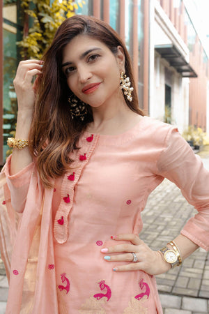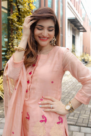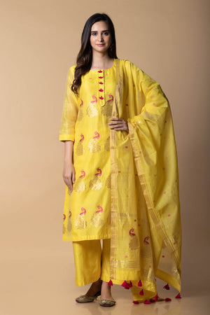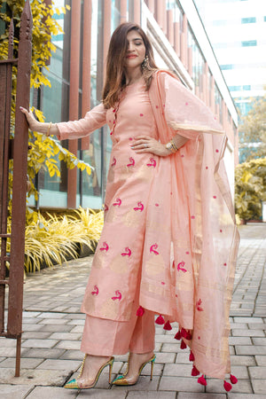 Get classy in our woven classy simple suit set .You can see beautiful peacocks woven on kurta and dupatta
