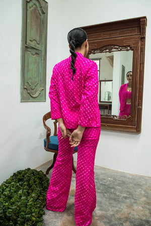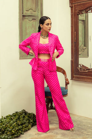 A hot pink leheriya bustier with a matching blazer and a pair of fit-and-flare gorgeously tailored pants, with mirror work detailing on the belt, make this ensemble the pantsuit of your dreams.